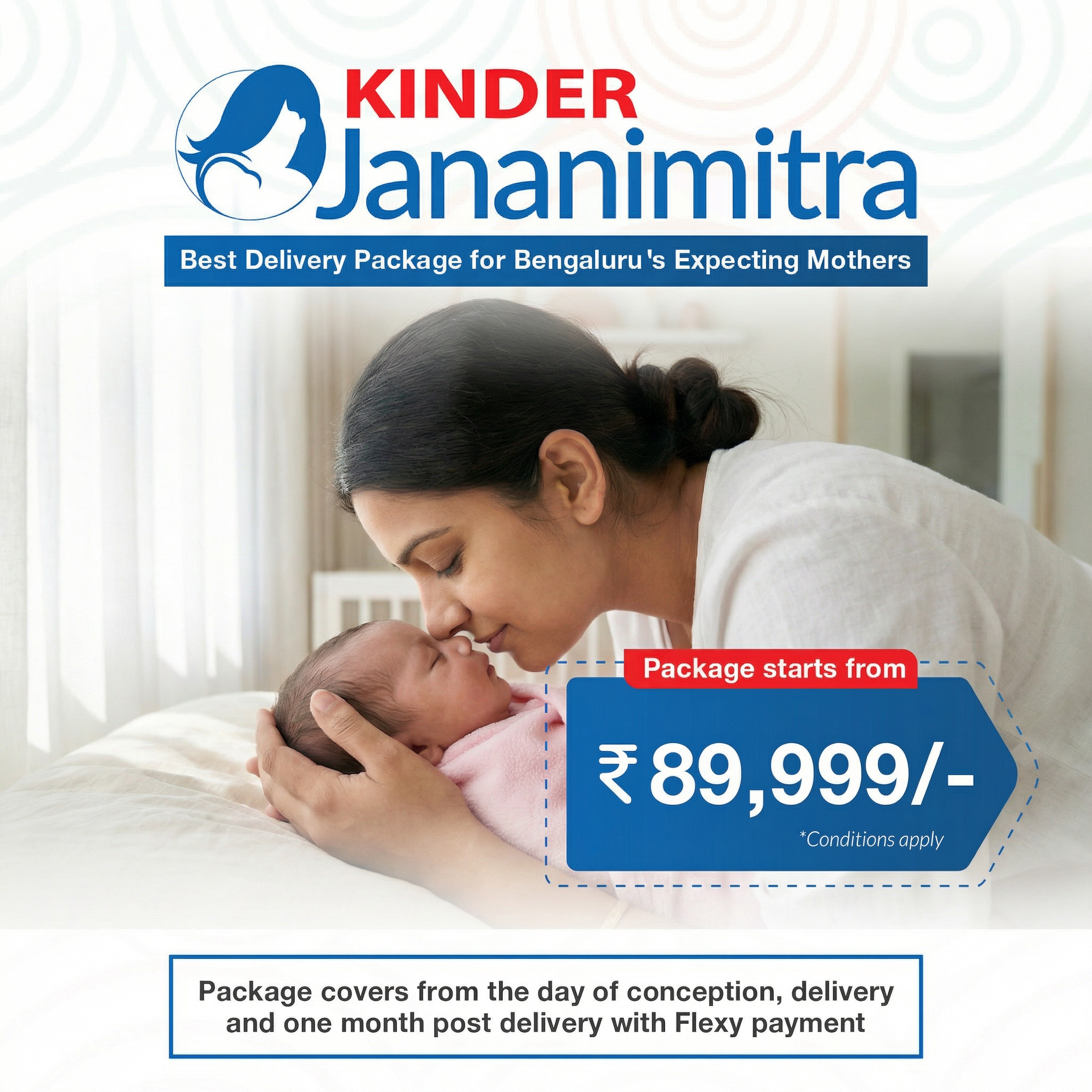 “Kinder Janani Mitra” will cover care for you in all three phases of your delivery i.e. pre-delivery, during delivery and post-delivery to ensure a perfectly healthy mother and baby. With complete care for you at all times, including priority access to the benefits of the package, you can experience a hassle-free birthing experience. We stand by your side every single moment during your amazing journey of pregnancy and birthing.